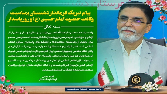 ولادت باسعادت حضرت اباعبدالله الحسین (ع)، سید و سالار شهیدان و مظهر ایثار، آزادگی و حق‌طلبی، که به‌درستی «روز پاسدار» نام‌گذاری شده است، فرصتی مغتنم برای تجلیل از رشادت‌ها، مجاهدت‌ها و ایثارگری‌های پاسداران سرافراز انقلاب اسلامی است که با الهام از نهضت عاشورا، همواره در مسیر صیانت از آرمان‌های والای نظام مقدس جمهوری اسلامی ایران گام برمی‌دارند.