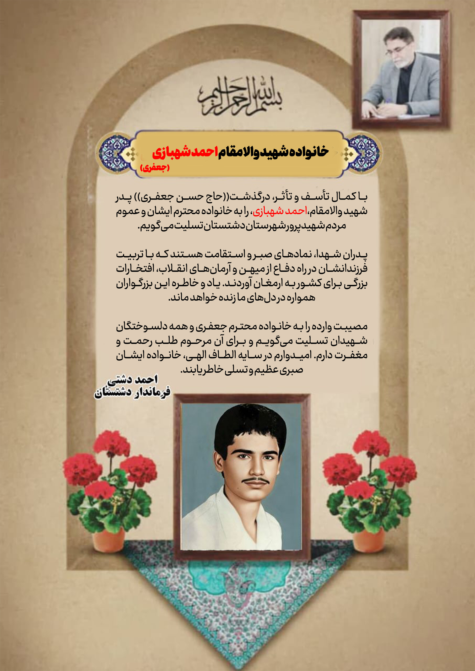 پیام تسلیت فرماندار دشتستان در پی درگذشت پدرشهید والامقام احمد شهبازی (جعفری)