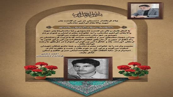 با کمال تأسف و تأثر،درگذشت ((مشهدی رضا شادمان)) پدر شهید والامقام، ابراهیم شادمان، را به خانواده محترم ایشان و عموم مردم شهیدپرور شهرستان دشتستان تسلیت می‌گویم. پدران شهدا، نمادهای صبر و استقامت هستند که با تربیت فرزندانشان در راه دفاع از میهن و آرمان‌های انقلاب، افتخارات بزرگی برای کشور به ارمغان آوردند. یاد و خاطره این بزرگواران همواره در دل‌های ما زنده خواهد ماند. مصیبت وارده را به خانواده محترم شادمان و همه دلسوختگان شهیدان تسلیت می‌گویم و برای آن مرحوم طلب رحمت و مغفرت دارم. امیدوارم در سایه الطاف الهی، خانواده ایشان صبری عظیم و تسلی خاطر یابند.
